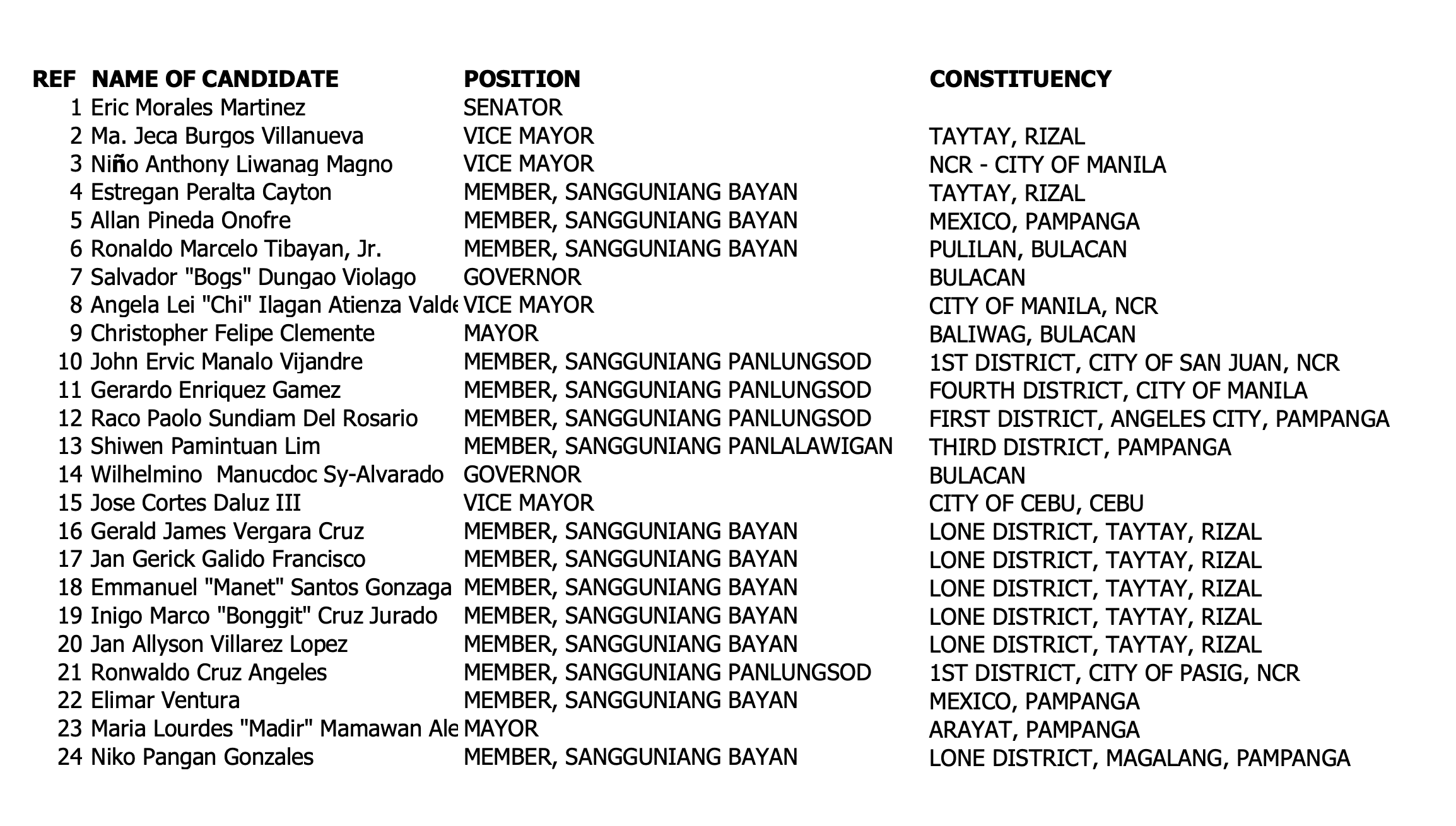 Among the candidates facing charges are senatorial aspirant and Valenzuela Second District Rep. Eric Martinez, mayoral candidate Christopher Felipe Clemente, and gubernatorial candidates Salvador “Bogs” Dungao Violago and Wilhelmino Manucdoc Sy-Alvarado.